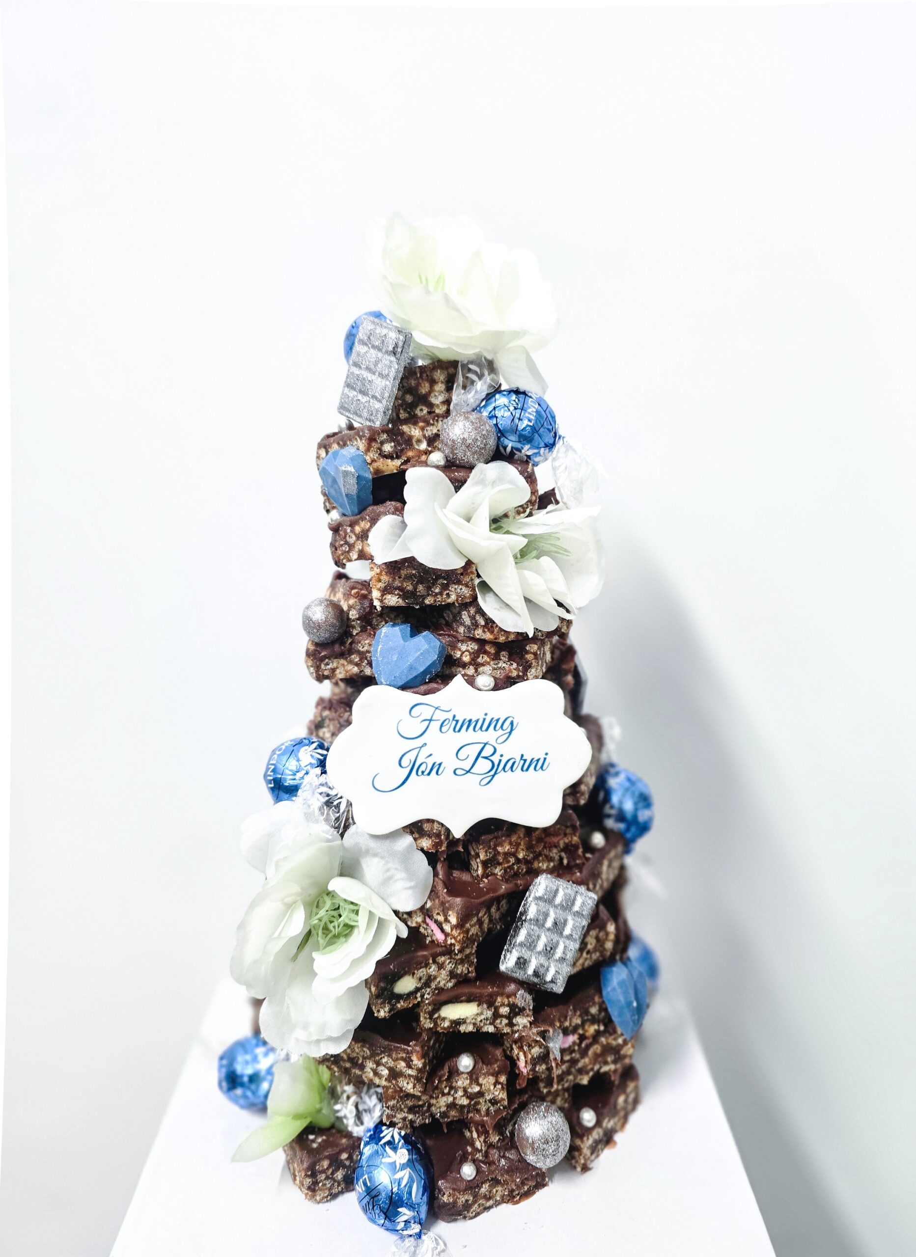 Dásamlegt döðlugott raðað í turn og skreytt í því litaþema sem við á. Þegar kemur að greiðslusíðuna er hægt að skrifa í lýsingu hvað á að standa á skiltinu eða hvort á að sleppa því.